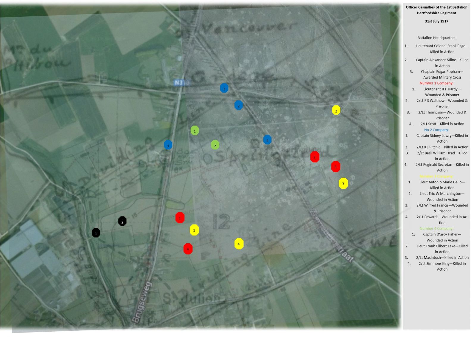 Those Officers who served at St Julien are easier to trace due to mentions in various diaries and contemporary accounts. The following Image shows (where known) the location that each of the 20 Officers with the Herts was either Killed, Wounded or Captured that day. Each Company is identified by colour; Battalion Headquarters = Black, No. 1 Coy = Red, No. 2 Coy = Blue, No. 3 Coy = Yellow, No. 4 Coy Green.