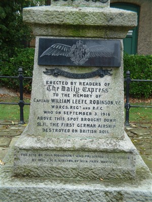 On the night of the 3rd September 1916 the war arrived in a very real way to the small village of Cuffley. A Schutte-Lanz airship SL-11 (a wooden airship which was lighter than a Zeppelin) was on a bombing raid over London and was successfully attacked by 2nd Lieutenant (later Captain) William Leefe Robinson of the No.39 Home Defence Squadron. His small biplane used a new type of incendiary ammunition to set the ship alight. SL-11 came down to earth behind the Plough Inn at Cuffley. The entire 15-man crew was killed. It became the first airship shot down on British soil and Leefe Robinson was awarded the Victoria Cross for his actions. A memorial stands on the sight of the crash today.